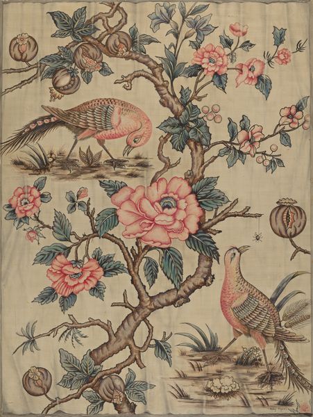 Editor: Here we have Eleanor Cunningham’s “Embroidery” from around 1937. It appears to be a textile work incorporating painting and drawing, featuring watercolor. The colour palette is soft yet vibrant. The abundance of floral elements and its somewhat weathered state create an intriguing romantic atmosphere. What underlying themes do you observe? Curator: It is definitely romantic in its subject matter and execution. But let's think about "Embroidery" as existing within a very specific socio-political framework. This piece was created during the interwar period; given that the artist is a woman, what implications does this context carry for us? Think about how artistic expression, particularly domestic craft like embroidery, could be viewed as a form of resistance or personal empowerment during this period. Editor: Interesting. So, perhaps choosing a traditionally “feminine” craft like embroidery, was her conscious statement? Curator: Exactly. By engaging with this medium, Cunningham potentially subverts its conventional association with domesticity and subordination. She is not only producing a beautiful object but also asserting her presence and voice within a patriarchal society. Now consider the floral motif, how might it function beyond mere aesthetics? Editor: Flowers often represent growth, beauty, fragility… could it be a statement about the female experience? Curator: Precisely! The flowers become symbols of resilience, mirroring women who navigated a rapidly changing society. This is further intensified when we examine the colours; against the intense ground, soft pinks fight their way to visibility and recognition. The pattern of growth that’s replicated becomes its own system. This textile serves not only as a pretty decoration, but as a site where gendered power dynamics and expressions of identity intersect. What’s your final impression? Editor: It really reframes the whole piece for me, knowing it may have these deeply personal, even radical roots. Thanks for shedding light on the historical layers within such a seemingly conventional work. Curator: Absolutely. It highlights the power of art to serve as a silent yet potent form of social and political commentary.