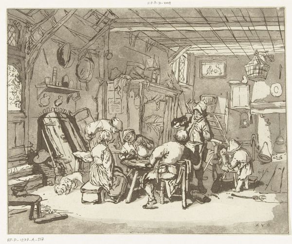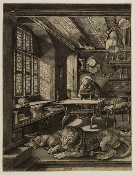 Curator: This is an engraving, Saint Jerome in his Study, by an anonymous artist. The plate measures about 24.6 by 18.7 centimeters, a rather intimate scale. Editor: It's quite captivating! The distribution of light and shadow immediately creates a mood of contemplative stillness. Curator: Consider the labor involved: meticulously incising the image onto a metal plate, the precise control of line weight and density to mimic the effect of light. And observe the objects—skull, books, hourglass—symbols made accessible through the printing press. Editor: And the composition itself, how the lines converge and intersect to guide the eye. The way the lion and dog anchor the foreground, drawing you into the saint’s chamber. It really creates a sense of depth and perspective. Curator: Yes, a blend of craft and symbolism, making complex ideas accessible to a wider audience. Editor: It's a powerful testament to the beauty inherent in simple lines, isn't it? Curator: Indeed, an intimate view into faith, knowledge, and the role of the printing press.