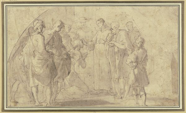 Editor: So, this is Joseph Highmore's "Sketch of a Group of Five Gentlemen around a Table." It's a delicate graphite drawing. The composition feels very dynamic, even unfinished. What compositional elements strike you? Curator: Indeed. Note the artist's delicate yet confident use of line. See how the varying weights and densities create depth and shadow, defining the forms of the figures and objects. Editor: It's like a conversation captured mid-sentence, and I see what you mean by the lines creating depth. I noticed the globe. Curator: Observe how the background elements, such as the globe and the suggestion of architectural details, serve to frame the figures, pushing them forward in the pictorial space. The strategic placement of light and shadow directs the viewer's gaze. Editor: It's amazing how much information is conveyed with so few lines. I'll definitely pay more attention to the use of lines in future works. Curator: Precisely. A close examination reveals the power of form and structure in conveying meaning.