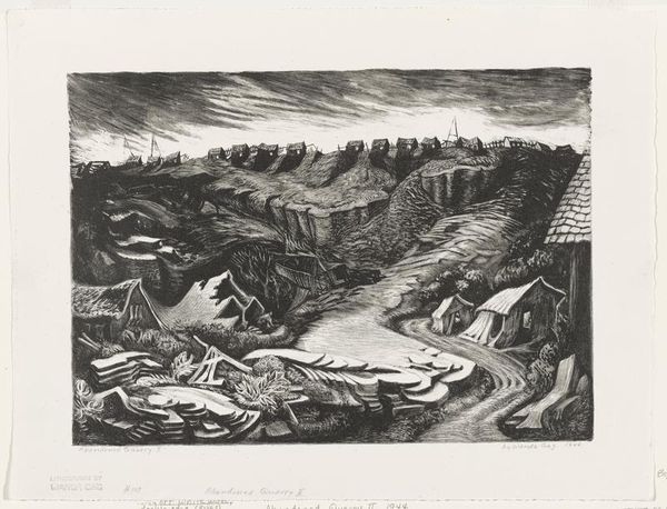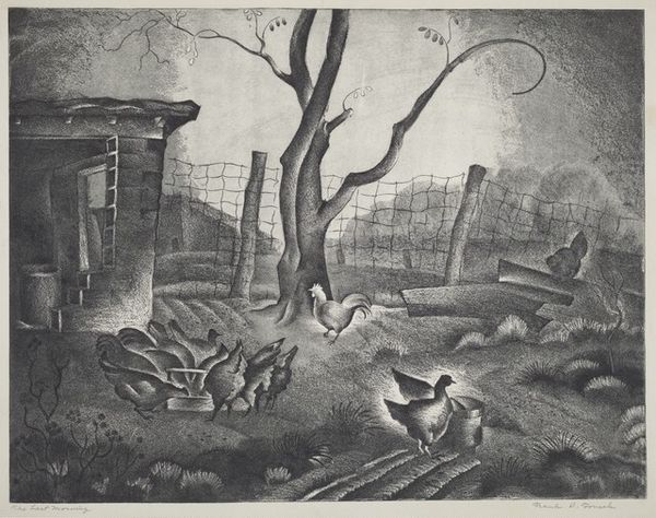 Curator: This print, titled "Harvest" by Letterio Calapai, was created in 1945 using woodcut techniques. At first glance, it feels quite stark. What strikes you? Editor: The overwhelming darkness of the composition, really. It gives off an almost melancholic feel despite depicting a harvest scene which is usually associated with abundance and prosperity. Curator: Yes, the heavy use of black is definitely key to understanding the composition. The dense cross-hatching and linework create a very dramatic light-dark contrast, and a real sense of depth and texture in the fields, the sky, even the machinery. The sharp delineations between tones add to that drama. Editor: And what is the narrative being communicated? Because despite what you would usually feel for a work called harvest there’s that almost palpable sense of toil. These workers seem so entrenched in their labour; the lack of overt joy perhaps underscores a deeper commentary on class and labour relations, the often-invisible cost of food production during a wartime economy. Curator: Absolutely, situating this work within the socio-economic context of post-war America enriches our understanding of the thematic elements depicted. Consider the formal arrangement: The harvesting machinery, prominently featured, bisects the frame horizontally. Editor: A visual embodiment, perhaps, of industrialization encroaching upon traditional farming practices. Are the human figures merely components within a larger system, as are, the horses pulling heavy weight. A poignant perspective. Curator: It is, indeed. The contrast isn't just between light and dark, but also between traditional and modern agricultural methods, captured with precision by Calapai. Editor: Considering that Calapai immigrated to the USA as a small child and grew up to become involved in left-wing movements, it seems that his prints reflect the experiences and plight of workers. "Harvest", while formally compelling, really makes you think. Curator: I agree entirely. Thank you for framing it that way.