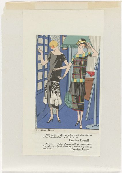 Editor: Here we have an illustration, “Art - Goût - Beauté” from 1928, showcasing "Feuillets de l'élégance féminine." It looks like a watercolor fashion plate of the Art Deco era. The woman has a distant look and stands by a window with great dignity, though her dress appears too large on her body. What can you tell me about this piece? Curator: This illustration evokes powerful visual memory precisely because it freezes an instant. Look at how the dress drapes; it has this clinging quality that contrasts against the woman's stoic stance. It captures the early modern era's shift in the symbolic presentation of women, hinting at a world in flux after the First World War. This period experimented with a certain androgyny, do you see it here, in her bobbed hair and rather severe look? Editor: I see what you mean. Her gaze has such an internal quality! The shapes on the window, combined with her cylindrical dress give a vertical effect which perhaps adds to that stoicism. Is that reading too much into it? Curator: Not at all. The window motif itself signifies not just light, but also the artist’s lens through which we, the viewers, observe the subject. In the same vein, she could be interpreted as not looking towards the exterior or beyond her material possessions; that blank gaze reinforces how fashion was consumed and, in effect, controlled the narratives of femininity during the era. What remains consistent are recurring aspirations: the desire for both modernity and classical composure. Editor: That’s fascinating. So, the image functions on multiple levels: advertising, societal reflection, and the immortalizing of fleeting trends? Curator: Precisely. Each element is a thread connecting the artwork to our collective understanding of beauty, aspiration, and the ever-evolving feminine ideal. These visual relics become keys unlocking the psychology of the period.