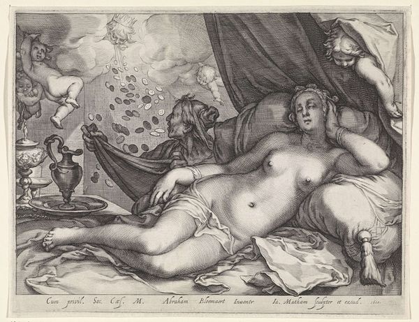 Curator: Here we have Arnold Houbraken's etching, "Sleeping Nymph with a Dog Spied Upon by a Satyr," created sometime between 1688 and 1700. It’s currently housed right here at the Rijksmuseum. Editor: My first thought? A definite… unease. This isn't just a pastoral scene. The vulnerability of the sleeping nymph, contrasted with the satyr's leering gaze, it’s quite jarring. Like stumbling into someone else’s dream—or nightmare. Curator: That contrast is very deliberate. Houbraken utilizes the figure of the satyr, a stock character within mythological narratives, to explore themes of voyeurism, temptation, and the inherent tension between the idealized and the base. This piece reflects prevailing ideas in Baroque period, doesn't it? The tension! Editor: Definitely picks up on that baroque dramatic flair. I’m noticing the fine detail etched into this piece; particularly the almost unsettling, watchful eye of the Satyr in the lower-left quadrant of the picture plane. But beyond the drama, I see an unexpected softness too. The dog is almost a sympathetic character, sleeping soundly in ignorance of the imminent trespass of privacy. Do you see something of that? Curator: Interesting you bring that up. You're not wrong, of course, but perhaps that softness underscores the moral message of the work? I see the dog also representing ideas of the innocence and fidelity now at risk in this vignette. Consider how that small, oblivious figure heightens the disturbing quality that lingers throughout the scene. The setting, though somewhat bucolic and rendered beautifully by the artists' etchings, is only meant to show just how *public* such vulnerability can be. Editor: Public! You hit on something I had not truly considered. So much classical artwork speaks to the hero’s journey or great feats in a public sphere, that is true; but here the intimate is forced into the full gaze of what might resemble spectators. Does this begin to question if our most private, peaceful selves are *ever* truly secure, then? I would expect nothing less from something wrought from the Dutch Baroque! Curator: Indeed. Houbraken challenges us to consider the ethics of observation, the gaze, and the ever-present threat to innocence within seemingly idyllic settings. Editor: And it's these layers, these tensions between beauty and threat, repose and intrusion, that continue to make "Sleeping Nymph with a Dog Spied Upon by a Satyr" so compelling centuries later. Art doesn't merely show, but often subtly challenges us in how we gaze at the very thing it wants to share.
