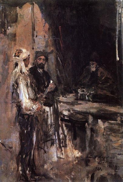 Curator: Here we have “Two Drunks,” an oil painting by Nicolae Grigorescu. What springs to mind when you look at this piece? Editor: Melancholy, definitely melancholy. It's the slouched posture and the murky light. You can almost feel the weight of their weariness settling over the scene. I imagine they've reached that quiet point where thoughts just swirl but don't quite land. Curator: Right, and in understanding the societal context, genre paintings such as this can offer powerful glimpses into marginalized communities and social commentary during the time in which Grigorescu was creating. Considering Romania's evolving national identity and social reforms in the late 19th century, how do you feel such pieces challenged or reinforced popular beliefs? Editor: Oof, challenged, I reckon. Back then, it would have been like looking in a broken mirror – a harsh reflection that makes you cringe. Showing poverty or despair head-on, not romanticizing it. The artist definitely had a viewpoint here, wouldn't you agree? He understood their stories… or at least was attempting to capture their essence. Curator: Exactly. Grigorescu's application of color in rendering these figures seems intentional, drawing viewers into this space to consider these realities. Do you see symbolism that provides social perspective or adds emotional depth? Editor: Hmmm... that nearly empty bottle right between them says plenty. The drab coloring… not glamorous drunkenness, is it? Also, the blurred faces imply we can never completely know these men. There's something about those small stools too— precarious, uncomfortable. I can almost hear their muffled conversations. Curator: Your perspectives provide critical entry points that consider class dynamics. What stays with you most? Editor: I am hit by their resigned posture; their complete vulnerability. It speaks to human frailty, doesn’t it? Beautifully wrought through the darkness, really. Curator: Indeed. Art such as “Two Drunks” pushes viewers towards greater dialogues in social understanding.