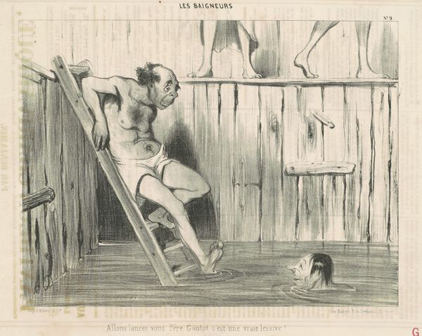Curator: Let’s observe this lithograph by Honoré Daumier. Created in 1858, it's titled "At the Deligny Baths. - The ladder at 4 p.m.," a plate from his "Croquis D'Été" series and it is on display here at The Art Institute of Chicago. Editor: Immediately, I'm struck by the density and dynamism of the scene. There’s a kind of claustrophobic energy—a lot of bodies crammed into this bathing space. You feel a collective effervescence, despite the very mundane activity. Curator: Daumier, as an observer of Parisian life, was fascinated by portraying the everyday activities of the bourgeoisie. The bath, in this context, takes on symbolic weight. Water, a signifier of cleansing and renewal, acts here, somewhat ironically, as a site of public gathering, a social arena. Editor: Exactly. These communal baths weren't just for hygiene. They reveal the era's social stratification and its rituals around leisure. The different actions and expressions seem to signify some tension: look at those faces! Anxiety? Discomfort? Humorous despair, maybe? This isn't exactly the relaxing idyll that we might expect in an image of leisure. Curator: Yes, there’s an almost theatrical quality. Consider the ladder—a visual motif central to the composition. It alludes to upward social mobility, or perhaps the performative aspect of these spaces. People clambering for status or attention, maybe? Editor: And Daumier's loose, sketch-like rendering with lithography serves to underline the fleeting nature of the scene. It also humanizes his subjects, showing all the imperfect bodies without sentimentality. No classical idealism here. Curator: Precisely, a sort of anti-heroic presentation. I wonder what Daumier wished to tell the viewers by calling out the precise time in the title. Perhaps he meant to create an opportunity to pause and observe the ordinary and transient aspect of that single moment. Editor: For me, this lithograph captures a slice of 19th-century Parisian social reality and its anxieties. It's fascinating how an image of leisure can reveal underlying societal tensions, power dynamics, and that desire for social visibility. Curator: It highlights how such simple moments carry multilayered meanings that reflect deeper currents within a specific historical and cultural framework. Editor: Yes. Ultimately, it prompts us to consider the symbols and situations we inhabit and participate in today.