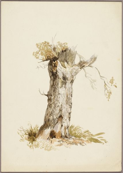 Curator: Good morning. We are looking at "Leafless Tree", a watercolor drawing executed around 1846 by Stephan Rauh, now held in the Städel Museum collection. Editor: Its starkness immediately strikes me. There's a rawness to the bare branches, an unadorned quality that emphasizes the stark silhouette against what feels like a vacant sky. Curator: Indeed, the piece is fascinating in its simplicity. Note the artist’s employment of subtle washes, barely-there brushstrokes in brown and gray, creating an almost monochromatic study. What effect do you think this reductive palette has on the viewer? Editor: It forces the eye to trace the structural aspects—the reaching, almost pleading lines of the branches, and the rugged texture of the trunk. One considers ideas of fragility and the exposed structure of life. The tree becomes less a representation of nature, and more a symbol for it. Curator: Absolutely, and within the context of the Romanticism movement prevalent at the time, this starkness can be viewed as a metaphor for the human condition: exposed, vulnerable, yet enduring. It perhaps represents the spiritual resilience amidst life’s harsher realities. Editor: Yet the social impact can be taken further. Consider Germany at the time; industrialization was encroaching, and the old rural ways were being replaced by rapid urban expansion. It is not hard to believe Rauh captures a lost era; representing not merely a botanical sketch but also societal change. Curator: A astute connection to draw—it also is a commentary on our relationship with nature—how we value it and how we preserve it, captured poignantly. This humble watercolor asks us important questions about the society we wish to construct. Editor: So, what seemed at first to be a minimalist rendering turns out to be a remarkably dense symbolic meditation, reflective of Romantic ideals. Curator: Indeed. And hopefully it prompts continued reflection from our visitors long after they leave this room.