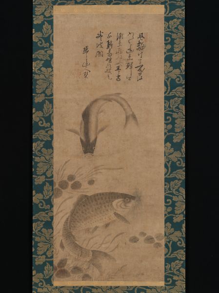 Soga Shōhaku painted "Carp", part of a triptych of Taigong Wang, using ink and color on paper. The fish ascends in the composition, its form dynamically emerging from and blending into its misty surrounding. Shōhaku employs a graded wash technique, with the ink's tonality creating a dreamlike quality. The artist uses strong, controlled brushstrokes to define the carp's scales and fins. The textures created through these brushstrokes contribute to the tactile sensation of the fish's body, contrasting with the softer rendering of the water. The deliberate composition activates a dialogue between the solid and the ethereal. This interaction can be interpreted through a lens of semiotics, where the carp symbolizes perseverance and the misty waters represent the challenges of life. The dynamic tension between these elements, and the implied narrative of the carp's struggle against the current destabilizes fixed notions of harmony and balance, reflecting the artist's engagement with the philosophical currents of his time.