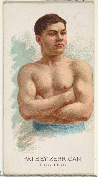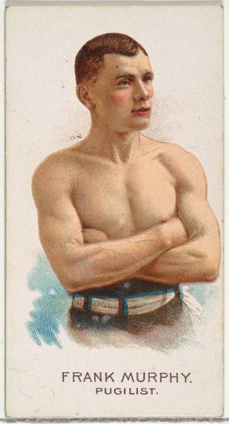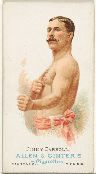 Editor: This is “George La Blanche, Pugilist,” a drawing printed for Allen & Ginter Cigarettes in 1888. It’s part of the "World's Champions" series, and it features a bare-chested boxer with a striking mustache. What's fascinating to me is the delicate rendering alongside the hyper-masculine subject matter. How do you interpret this work? Curator: I see a complex negotiation of power and representation. Think about the historical context: Cigarette cards were used as marketing tools, often valorizing certain ideals of masculinity and athleticism. This image, then, participates in a visual culture that's constructing ideas about the male body, strength, and even class. La Blanche, the pugilist, becomes a commodity, literally packaged with a product. What does it mean to sell an image of masculine power alongside an addictive substance? Editor: So, the card is less about La Blanche himself and more about selling a certain kind of image? Curator: Precisely. And who is the intended consumer? How might this image appeal to anxieties or aspirations related to masculinity? Consider the delicate watercolor technique against the rugged subject. Does this soften the edges of boxing, making it more palatable? Also, who has access to art like this? Who is excluded from owning it or identifying with it? Editor: It's making me rethink the relationship between celebrity, commercialism, and these older ideas of manliness. Curator: Right. These images helped to shape a dominant culture and solidify certain hierarchies. We can look to theory and history to help us unpack how art participates in these formations. Editor: This card becomes a fascinating window into those complexities. Thank you. Curator: It’s in questioning what’s represented, and *how*, that we see power relations come to light, isn’t it?