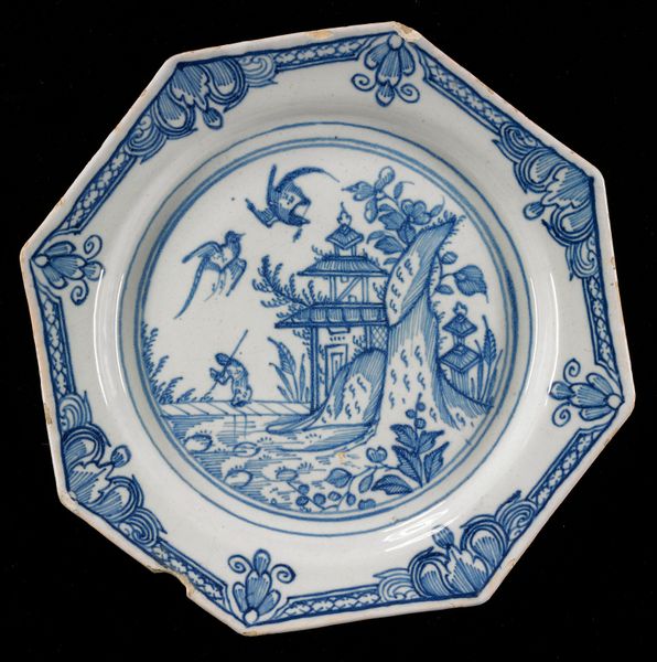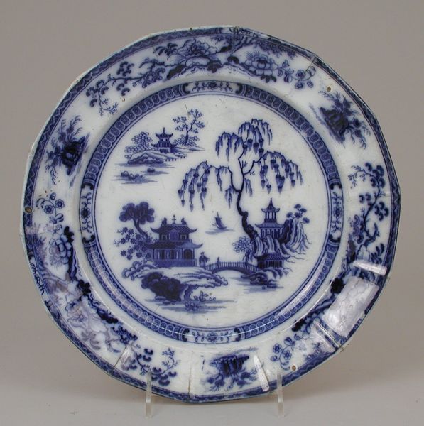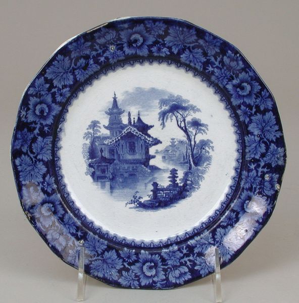 This plate was made by John & William Ridgway in the 19th century, decorated with a transfer-printed scene in cobalt blue. The central image presents an orientalist vision, replete with pagodas, boats, and figures in a distant, exotic land. These motifs are reminiscent of the Chinoiserie style popular in Europe since the 17th century, which reimagines Eastern culture through a Western lens. Consider the pagoda, a symbol deeply rooted in Buddhist and East Asian traditions, representing spiritual ascent and harmony with the cosmos. Its presence here speaks to the enduring allure of the East, yet transformed and reinterpreted for a Western audience. The waterways and ships evoke notions of trade, exploration, and cultural exchange, which in this context, hints at the complex history of colonialism and cultural appropriation. The stylized floral patterns around the plate's border mirror those found in Chinese porcelain, illustrating how cultural symbols evolve as they travel across time and space. This adaptation reflects a blend of admiration and the superimposition of Western aesthetic preferences on Eastern cultural artifacts. The plate serves as a vessel, carrying not just food, but also layered meanings of cultural encounter and transformation.