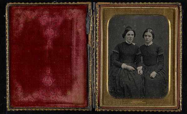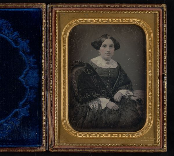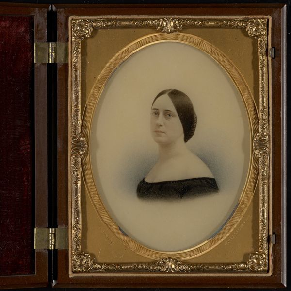 This is a photograph by Jeremiah Gurney, a bust portrait of a young woman in the mid-19th century. Consider the oval frame: its continuous loop echoes the Renaissance tondo, a format for portraits that emphasized wholeness and unity. This shape has roots stretching back to antiquity, symbolizing eternity and divine completion in various cultures. Similarly, the floral motifs embossed on the velvet case evoke images of fertility and cyclical renewal. Throughout time, portraiture has served not only as a record of appearance but also as an assertion of identity and status. Here, the deliberate framing and presentation elevate the sitter. These motifs are not static symbols but rather dynamic carriers of cultural memory, continuously evolving in meaning as they resurface across different eras. The image engages us on a deep, subconscious level, where archetypal symbols evoke collective memories and resonate with primal emotions.