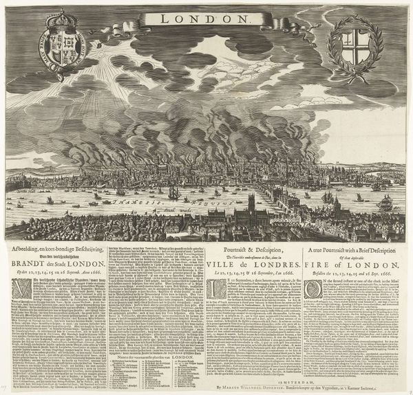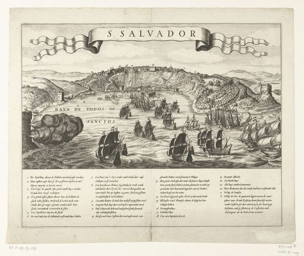 This is an anonymous print depicting the Conquest of San Salvador in Brazil by Admiral Jacob Willekes in 1624. The image, rendered in monochrome, presents a bird's-eye view of the battle, with a dense array of ships populating the bay, set against the backdrop of a fortified cityscape. The composition is structured to convey depth and movement, yet the visual field is flattened, typical of the period’s cartographic and illustrative styles. Formally, the print uses a combination of linear precision and textural variation to distinguish between the elements. The detailed rendering of the ships and the city contrasts with the more schematic depiction of the landscape. The use of text within the image, both as titles and as explanatory notes, integrates textual and visual modes of representation. Such prints functioned not only as records of historical events but also as instruments of propaganda, shaping public perception of Dutch colonial endeavors. The ordered arrangement of the ships and the strategic positioning of the cityscape convey a sense of Dutch power and control, reflecting the broader geopolitical ambitions of the time.