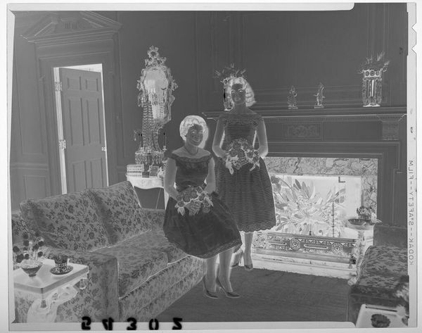 Editor: This photograph by Jack Gould, titled "Untitled (two girls playing 'dress-up')", captures a childhood scene. The negative tonality gives it a ghostly, dreamlike feel. What resonates with you when you look at this image? Curator: The inverted tones transform the familiar game of dress-up into a symbolic realm. Childhood innocence, often depicted with bright colors, here becomes a study in shadow. What hidden aspects of play are revealed through this visual disruption, do you think? Editor: Perhaps it's about the fantasy becoming something darker, more complex? Curator: Precisely. The 'dress-up' itself is a potent symbol, representing the adoption of roles and identities. The inversion suggests a deeper questioning of these roles, a hint of the uncanny within the ordinary. A memory, made strange. Editor: That reframing really alters my perspective on this piece. I now see the photograph as more than just a simple snapshot. Curator: Indeed. By disrupting our expectations, Gould invites us to reconsider the weight and meaning behind seemingly innocent activities and explore the cultural memories attached to them.
