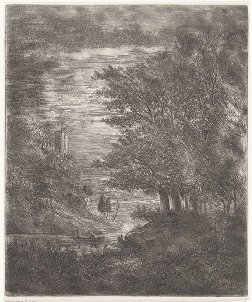 Curator: This landscape practically whispers tales of another time. It's as if the stones of the abbey themselves remember the prayers and the lives lived within those walls. Editor: It's arresting, isn't it? Somber, almost brooding. The heavy, dark foliage seems to press in on the ruined abbey, a kind of visual weight on the past. Curator: It's Joseph Pennell's "Egglestone Abbey, from the River," created around 1899. Pennell was an American expatriate, deeply influenced by Whistler and known for his etchings, drawings, and lithographs, capturing scenes from around the world. You can find this print at the Art Institute of Chicago. Editor: An etching. That explains the dense cross-hatching, giving it that almost oppressive feel. The composition leads your eye straight to the abbey, a lone structure bravely holding its ground. What does the abbey represent to Pennell, do you think? Curator: The ruins act as a potent symbol, signifying not just religious faith but the passage of time, the inevitable decay that befalls even the most steadfast institutions. The abbey's silhouette suggests resilience, though, standing defiantly amidst nature’s reclamation. Editor: You are right about that feeling of resilience; it’s quite the dynamic. Consider how the social climate during Pennell's time informed his aesthetic choices. Late Victorian England grappled with immense industrial growth alongside nostalgia for a rural past. How did this artwork reflect or critique society? Curator: Pennell’s technical virtuosity shines through in capturing both the architectural detail and the atmosphere of melancholy, but yes, there is tension. It served, for some viewers, to validate cultural heritage at a moment of social upheaval and intense urbanism. Editor: A stark reminder that history is always present, influencing how we view and value these lasting structures. It asks, who controls the narrative? Whose stories are prioritized when history's pages turn? Curator: It seems that Pennell, and we viewers too, can connect the abbey's story with larger tales of perseverance and shifting cultural values by using this location and artwork as a sign. Editor: Beautifully put! Thanks to that contrast—the heavy textures next to the skeletal building—we can connect viscerally.