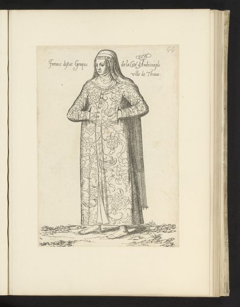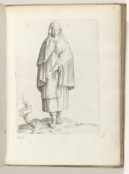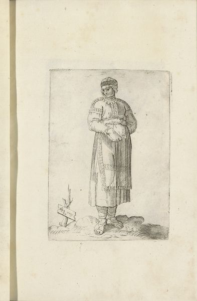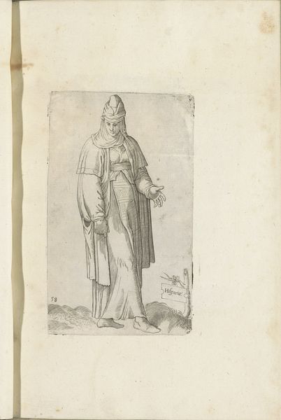 Fernando Bertelli's "Getrouwde vrouw uit Afrika," an engraving now at the Rijksmuseum, immediately presents a study in contrasts and subdued tones. The composition is dominated by the figure of a woman, rendered with delicate lines that delineate the folds of her garments. These lines both reveal and conceal, inviting the viewer to consider the interplay between exposure and concealment. The woman’s gesture, extending her hand, is a focal point, directing our gaze and creating a sense of connection and inquiry. Her posture and dress, identified as belonging to a married African woman, situate the work within a colonial context, prompting us to consider how identity is constructed through representation. Bertelli’s choice of engraving allows for precise detail. The varying densities of line create subtle gradations of tone, evoking depth and texture. The artist uses line not just descriptively, but also expressively, shaping our perception and engaging us in a dialogue about representation, identity, and cultural exchange.