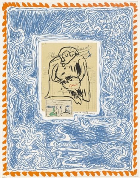 Curator: David Hockney created this etching with aquatint titled "A Picture of Ourselves" between 1976 and 1977. It's a mixed-media print featuring both figuration and nude themes. My initial impression is a dreamlike juxtaposition of forms. What are your thoughts on it? Editor: It certainly has that surreal quality, doesn't it? My eyes are drawn to the peculiar symbolism; it feels like glimpsing into someone's subconscious. What do you make of the positioning of that strange sculpture and the green… creature, I suppose? Curator: The composition creates a fascinating dialogue between interiority and exteriority. The stylized figure contrasts sharply with the almost cartoonish image behind what seems to be glass. One wonders about the personal or political currents that might be fueling Hockney's vision in this period. After all, the 70s were turbulent. Editor: Definitely turbulent times, but also times of great personal liberation. This piece is charged with personal symbols. The figure is vulnerable yet poised, almost ritualistic. Is Hockney perhaps inviting us to contemplate identity as a series of constructed images, a performance? I can't shake the feeling this is meant to tap into some Jungian archetype. Curator: Hockney’s work often blurs boundaries between reality and representation, engaging viewers in self-reflection, something of an inquiry into how societal norms shape our very identities. He had such a unique role in challenging those boundaries. Editor: True, and I’d say that's a reflection of his time and his involvement in reshaping queer representation and norms. Those simple color choices of a pastel like pink in contrast to that almost alien-like green could certainly tell a narrative on identity and how that plays on the stage of his experience. I’m wondering where this fits in to queer modernism and its influences? Curator: His approach to portraiture often reflects the influence of modernism’s fragmentation, offering not a singular view, but multiple perspectives, influenced of course by socio-political considerations. These reflections ask us, do these figures truly reveal themselves, or do they embody masks curated to manage social anxieties? Editor: A profound question, truly. "A Picture of Ourselves" certainly presents an image of both unveiling and concealing simultaneously. Curator: Ultimately, this work invites us to interrogate our own role in constructing narratives of self, amidst the backdrop of prevailing societal expectations. Editor: An unforgettable image of complex emotions woven with intriguing visual motifs that endure beyond any fixed interpretation, which reflects back onto the viewer long after the gaze has passed.