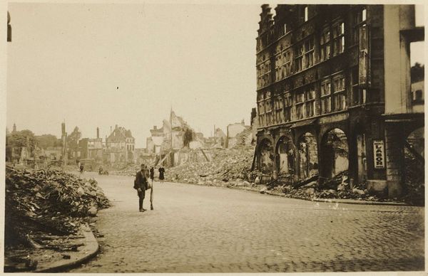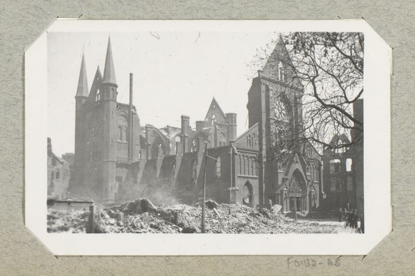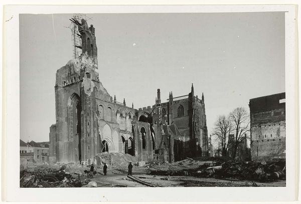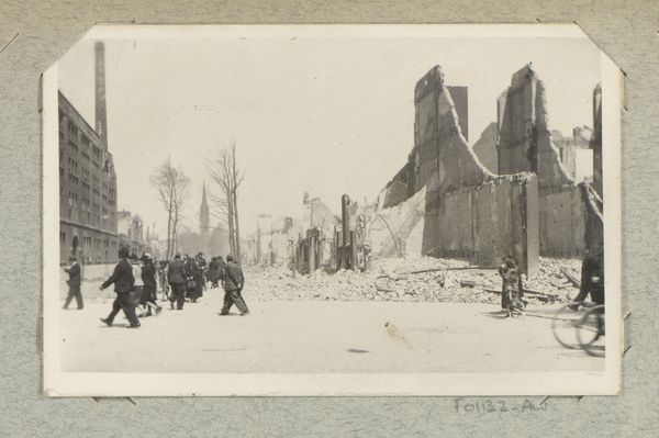 Curator: It has an unsettling calm to it, doesn’t it? Editor: It does. We’re looking at "Ruïnes rond de Grote of Sint-Laurenskerk te Rotterdam," a gelatin-silver print made by J. Nolte, sometime between 1940 and 1945. The image depicts the ruins around the St. Lawrence Church in Rotterdam. Curator: The monochrome really enhances the feeling of bleakness. It feels like the color has been leached out of the world. It really makes one think of those dark times during the war, doesn’t it? Editor: Absolutely. The photograph captures the aftermath of the bombing of Rotterdam, an event that had profound social and political implications. Nolte’s photograph, beyond documenting the devastation, serves as a potent symbol of resilience and urban trauma. Notice how the skeletal remains of buildings frame the sturdy church tower. Curator: I do. It is haunting, seeing ordinary life just sort of carrying on amongst all that ruin. I notice small groups of people here and there. Are they rebuilding? Mourning? Or both? Editor: It’s likely a mixture. The photograph offers a glimpse into the lived experience of those who remained, a poignant reminder of the collective effort required to rebuild not only structures but also social fabric. It became crucial to shaping postwar Rotterdam's identity, representing the will to rebuild against incredible odds. The church almost becomes a symbol of their determination, no? Curator: The church is definitely standing tall. To think this was somebody's home or their shop, their everything. Sobering. And Nolte capturing all this makes this piece also important, as a historical artifact that can elicit empathy and prompt a vital connection to our shared history. Editor: Indeed. By choosing a viewpoint that places us amongst the people within the wreckage, Nolte evokes a sense of unity and collective struggle. These ruins become a public site, an arena for recovery. Curator: Beautiful and terrible. It's quite the contradiction that Nolte captured. I feel quite contemplative, as I consider the weight of those ruins. Editor: And perhaps that’s its lasting power—making us consider what rises from the ashes, and how we memorialize, as well as learn from, catastrophic times.
