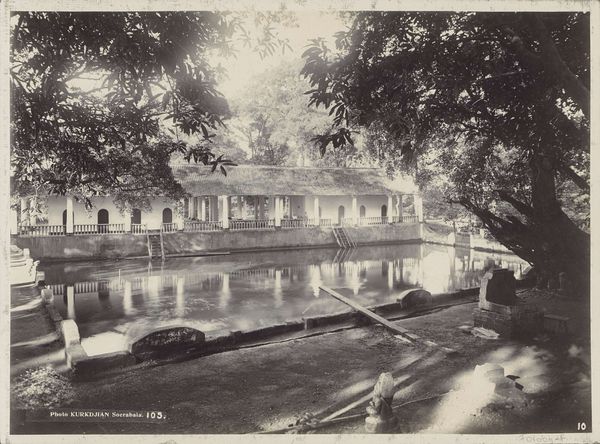 Curator: Here we have Samuel Bourne's photograph, "Satti Chaura Ghat on the banks of the Ganga river in Kanpur, Uttar Pradesh, India," a gelatin-silver print from between 1865 and 1866. Editor: Wow, it's… strangely still. Like time is holding its breath. All that grey, the water so smooth, it almost feels like a dream you can't quite grasp. Curator: Bourne was very interested in documenting the landscape and architecture of India during the British colonial period. His images offer us a glimpse into a time of immense cultural and political change. We can appreciate that colonial-era photography participated actively in promoting specific images of India for both domestic consumption in England and the British imaginary of the colony itself. Editor: I see what you mean about "promotion" — that controlled perspective, the careful framing. But the human element pulls me in. There are figures dotted along the ghats...washing, just existing in that space. There’s a poignancy there. Curator: Indeed. The ghats, those steps leading down to the river, served as vital public spaces. Religious rituals, daily life— Bourne's work brings attention to the very structure and organization of public space at the time. Note how this monumental construction dwarfs any other potential human element present in the picture. Editor: Absolutely! The grandness is there, for sure. But there's an earthy vulnerability too. That embankment looks fragile, like it could crumble any minute. The branches seem almost weighed down by the humidity, you know? Maybe it's romanticizing, but I can almost smell the river, that combination of damp earth and something… ancient. It's like, empire building with one hand, but nature slowly reclaiming things with the other. Curator: Perhaps it’s not nature “reclaiming”, but rather a subtle reminder of the inherent limits and impermanence of all human structures. These images played a crucial role in shaping perceptions of India and reinforcing a sense of the exotic ‘other’. Editor: See, and I wonder, standing there behind his camera, was Bourne aware of that push and pull? That his meticulous photographs were documents of power and yet held a silent song of place? Curator: Ultimately, Bourne's legacy resides in his beautifully rendered photographs and how we contextualize them within the narratives of history, representation, and colonialism. Editor: Well, regardless of his intentions, I am deeply drawn in— the technical precision alongside a raw, lingering essence… Makes it unforgettable.