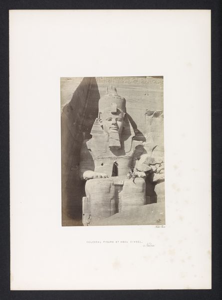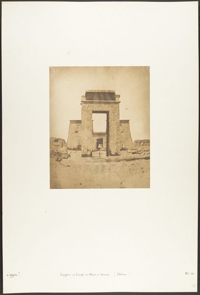 Maxime Du Camp made this photograph, 'Entrée du Spéos d'Athor, à Abousembil', using the calotype process, one of the earliest photographic techniques. Calotype uses paper coated with silver iodide, exposed in a camera, and then developed to create a negative image. What is remarkable is the way Du Camp's approach reveals the monumentality of the temple entrance. The soft, fibrous nature of the paper negative lends a texture to the image, emphasizing the rough-hewn quality of the stone facade. We see the huge statues flanking the entrance, each carved directly from the rock face. The process itself – the careful coating of the paper, the exposure, and the development – mirrors the slow, deliberate carving of the temple. Consider too, the labor required for both the original carving and for Du Camp’s expedition. Photography in the 19th century was not merely a matter of pointing and shooting; it involved laborious preparation and complex chemistry, often undertaken with the help of many hands. Du Camp's work bridges ancient craftsmanship and modern modes of production.