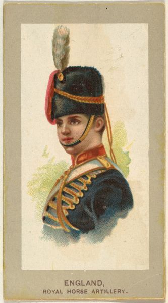 Curator: This lithograph, dating to 1881, is entitled "Highlander, 42nd Regiment, England." It comes from the Military Uniforms series produced by Abdul Cigarettes. Editor: It has this sort of quiet grandeur about it. The stark red uniform, that magnificent feathered cap—it certainly evokes the stoicism of the British soldier. Curator: Right, consider the historical context: the rise of mass-produced lithography allowed for distributing images widely. These cigarette cards offered glimpses into the visual culture of empire and military power—digestible and collectible representations. Editor: And how potent those images are! The uniform becomes an almost holy relic, encoding bravery and sacrifice. The tartan pattern and the red feathers aren't merely decorative; they symbolize Scottish identity woven into British military power. Think about the emotional impact on a viewer in that period, too. Curator: I'm curious about the production itself. Lithography was still quite labour intensive, involving skilled draughtsmen transferring images onto stone. These were essentially commodities distributed alongside tobacco, intended to foster brand loyalty. But even a mundane object can embed cultural meaning. The availability of such images democratized representation of military authority. Editor: Absolutely. The fact that these were essentially trade cards perhaps diminishes their status, but think about the repetition of these images – they are seen and felt daily, reinforcing their message. Each time one was purchased it embedded pride. Curator: It shows the interconnectedness of consumption, identity, and industrial processes. We might now look at this and consider questions about what imperial propaganda looks like. Editor: It reminds us of the symbolic power that even seemingly ordinary objects can hold and how those images have affected the fabric of the everyday life in history. Curator: Indeed, viewing this card is not simply a walk through history; it's a chance to better understand a moment of confluence. Editor: It shows how visual and material histories affect culture today.