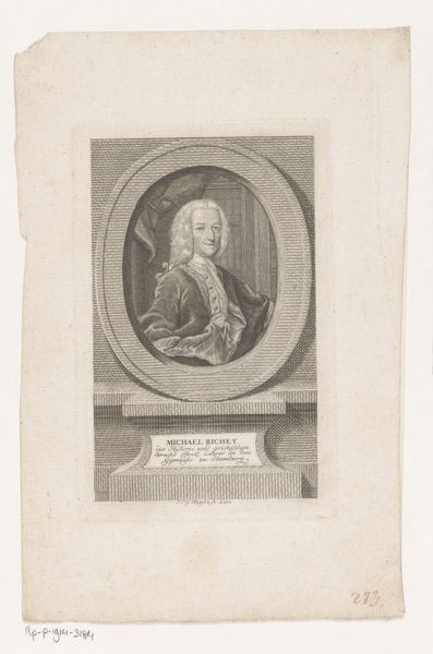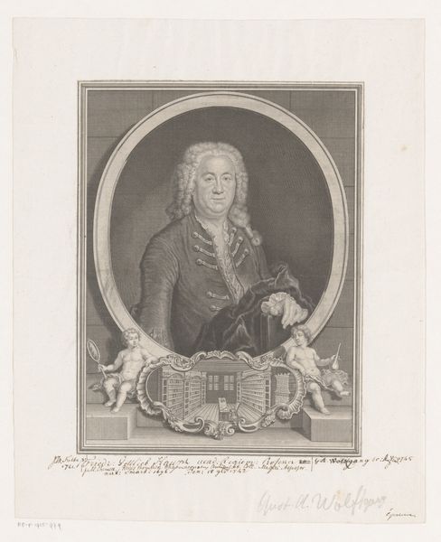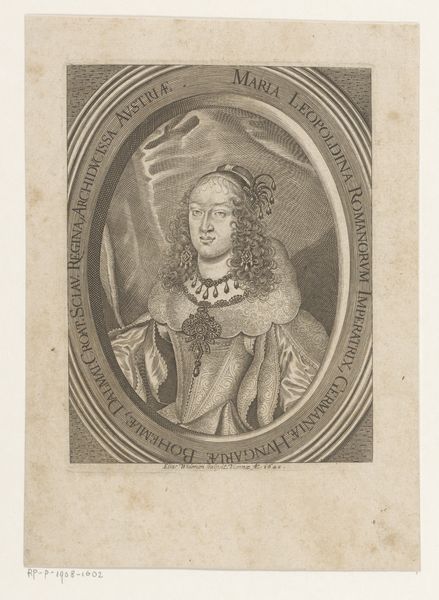 Editor: We’re looking at Johann Michael Schramm's "Portret van Josef August von Törring," created around 1835. It’s a pencil engraving, a meticulously rendered portrait. I'm struck by the layering of textures – the delicate lace juxtaposed with the rigid lines of the background. How do you approach a piece like this from a formalist perspective? Curator: Indeed. We observe here a study in contrasts, not merely of texture but also of form. Note how the oval of the portrait contrasts against the rectilinear backdrop. Schramm directs the viewer's gaze inwards using anaphora by replicating subtle internal forms, creating patterns and guiding the eye. Editor: So you're saying that the composition itself tells the story, independent of who Josef August von Törring actually was? Curator: Precisely. Disregard, for a moment, the representational aspect. Consider instead the artist's choices regarding line, value, and the spatial relationships between elements. Observe how the sharp, precise lines create definition while the soft gradations suggest volume. It begs the question of whether the composition transcends representation, becoming its own entity. What compositional elements contribute most strongly to this effect in your view? Editor: I think the tight, controlled lines definitely contribute, and the way the light and shadow are rendered almost sculpturally, gives it that distinct character. Curator: I agree. That, and how the artistic qualities evident here, such as the sharp contrasts and structured composition, show Neoclassical devotion to the line, and the engraving tradition overall. Thank you for observing this with me today. Editor: Thanks! That really sharpened my view.