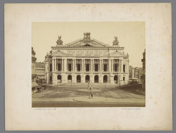 Curator: Here we have an albumen print titled "Gezicht op het Konzerthaus Berlin," dating back to 1880, captured by Sophus Williams. Editor: The first thing that strikes me is the imposing architecture. It's all sharp angles, hard stone, with this almost theatrical presence. Curator: Absolutely. It embodies a neoclassical style, prevalent at the time, reflecting power and order. The print offers a glimpse into Berlin’s urban landscape during a period of rapid transformation. Consider the historical context: Berlin was on the cusp of major industrial and social shifts. Editor: Right, and that stark composition tells us something about that context. Look at the labor implied: the quarrying of stone, the transport, the carving. Each pillar is a testament to the physical exertion embedded within this 'high art' structure. And that material—albumen—derived from egg whites, a whole separate industry supporting the photographic arts. Curator: That's a crucial material point. Thinking of materiality, though, this photographic image further reinforced societal structures. This Konzerthaus represented cultural capital, accessible mainly to the elite. Who was depicted in photography, who controlled its means? These were, and remain, potent questions of representation. Editor: Precisely! This wasn’t just about documenting architecture. It was also about framing who belongs, whose city this is. Look at the street, seemingly empty but swept, manicured; the landscaping planned; even that the building's name is clearly visible. This isn't just about aesthetics; it's about power, production, and access. Curator: By analyzing photography from a critical lens, we can better understand the power dynamics and social hierarchies that shaped its creation. It provides us a glimpse of a 19th century architectural monument that in and of itself serves as a monument to 19th century society and social structure. Editor: Yes, and thinking about how the materials, production methods, and aesthetic choices all coalesce really brings home the human, and specifically social and political labor behind this image and the building depicted. Curator: Thinking critically about these photographs moves us beyond passive viewing toward a deeper appreciation of history. Editor: And beyond aesthetics into the realm of societal influence.