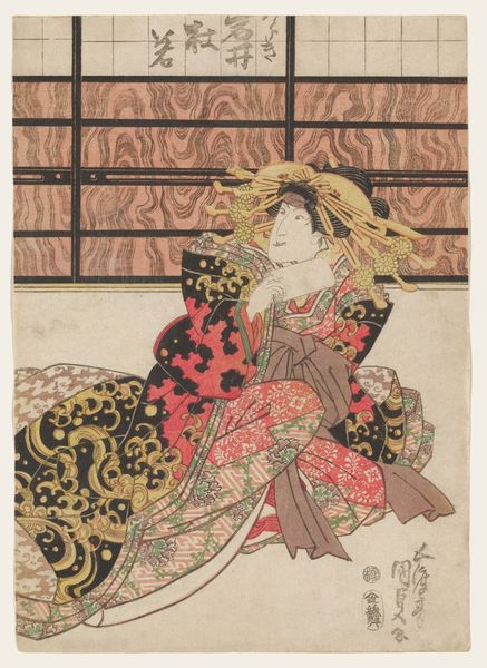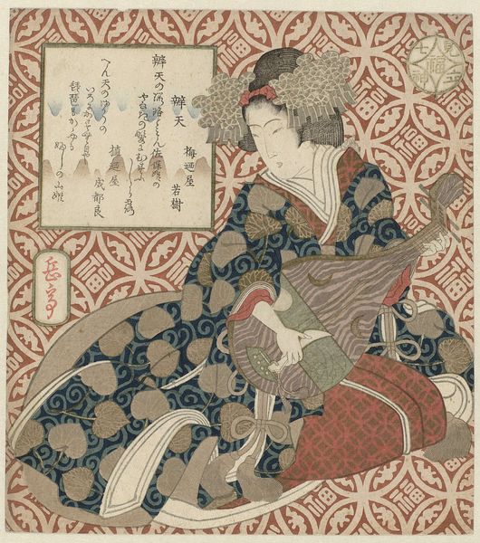 This woodblock print titled, *De courtisane Ôiso no Tora,* was created by Yashima Gakutei. The print’s composition is structured around a seated figure. Her elaborate garments command attention with intricate floral patterns and geometric designs. Note the tension between decorative flatness and attempts to suggest volume through shading and folds. The curvilinear form of her kimono contrasts with the geometric background. Observe how lines converge behind her, creating a focal point. This enhances the sense of depth. The stylized floral motifs arranged rhythmically in the top corners create a visual frame. The color palette is subdued, with blues, reds, and grays, which harmonize to create a tranquil yet sophisticated atmosphere. Consider how Gakutei uses pattern and line to construct meaning. How might these formal elements reflect broader cultural values or narrative traditions? The print invites multiple interpretations, leaving space for ongoing engagement and dialogue.