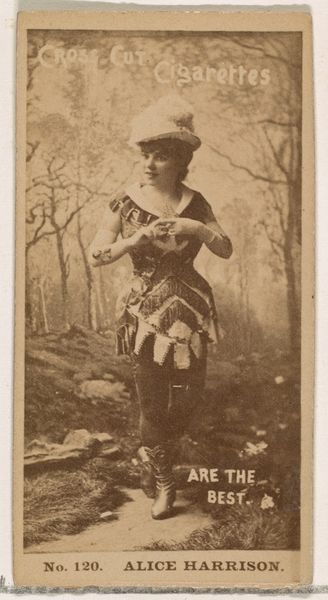 This photograph, 'Card Number 33, Vickers,' was produced around 1900 by W. Duke, Sons & Co. as a promotional card for Cross Cut Cigarettes. The actress Vickers is depicted in costume holding a small bird while carrying a cage. Consider the bird – a symbol of freedom and the soul. It's a motif that has resonated since ancient times. We can trace its evolution from Egyptian hieroglyphs representing the soul to Renaissance paintings where birds symbolize spiritual aspiration. The caged bird she carries reminds me of the eternal dance between freedom and captivity, a theme echoed across epochs. Think of the caged Psyche from Apuleius’s *The Golden Ass*, who must overcome imprisonment to find love and liberation. Such images tap into the collective unconscious, evoking primal yearnings for freedom, a powerful force that continues to engage us. The motif resurfaces, evolves, and takes on new meanings, connecting us to an emotional and psychological landscape that transcends time.