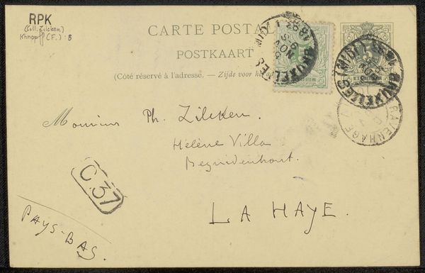 Curator: Let's delve into "Briefkaart aan Philip Zilcken" a piece by Fernand Khnopff dating from before 1894. Editor: Immediately, I’m struck by the sense of intimacy. It feels like a peek into a private correspondence. The spidery script and aged paper speak volumes, conveying nostalgia even before considering context. Curator: Exactly! Knowing Khnopff, this isn’t just a casual note. The postcard, rendered in pen and ink, to the Symbolist critic Philip Zilcken. Khnopff was very meticulous, but here the lines seem free, impulsive. As an artist deeply embedded within the Symbolist movement, issues of identity, social status, class and intellect often are included as the foundation for interpersonal exchange. Editor: Note the two stamps carefully positioned near the upper right. Stamps of that period bear heraldic symbols that reflect the prestige of imperial networks and governmental regulation, don't you think? And the postal stamps, bearing place and time—that’s communication technology rendered visible, making the transport of ideas visible to the user. Curator: Certainly. One can almost picture Khnopff meticulously selecting these stamps and even noting how these visual elements function when arranged together, and who gets to decide. But the Symbolist movement also focused a great deal of questioning around visual representation. Consider also the social role Zilcken played as a male art critic whose authority in his period was inarguable. Editor: I see your point, Khnopff seems interested in presenting himself in ways that are deeply intertwined with his own social and professional power. All carefully presented, even in what appears to be a fleeting, friendly communication. This makes this simple correspondence deeply meaningful in understanding artistic and social interactions from Khnopff's point of view. Curator: Indeed. Looking closely at even a simple sketch, we’ve uncovered a network of intentionality, identity, and silent yet persistent assertions of authority. Editor: An everyday object transformed into a fascinating portal into another time.