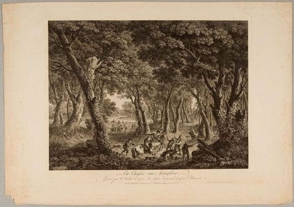 Curator: What strikes me first is the process of creating this print. Lerpinière, active in the late 18th and early 19th centuries, likely etched this on a copper plate. Imagine the labor involved in rendering such detail. Editor: It's a rather pastoral scene, isn't it? Despite the subject matter, the Israelites worshipping the Golden Calf, there's an almost idyllic quality to the composition. It's as if the artist is downplaying the sacrilege. Curator: Or perhaps he is highlighting the human need for tangible representations of faith, even if misguided. The material lure of the gold itself becomes central. Editor: Yes, and look how the Golden Calf is placed atop that classical pillar, almost like a civic monument. It speaks volumes about the socio-political underpinnings of idolatry and the power structures at play. Curator: Indeed. It is curious how the landscape is rendered with such detail, almost as if the natural resources themselves become complicit in this act. Editor: A fascinating perspective, considering how artistic trends mirror historical shifts in power and faith.