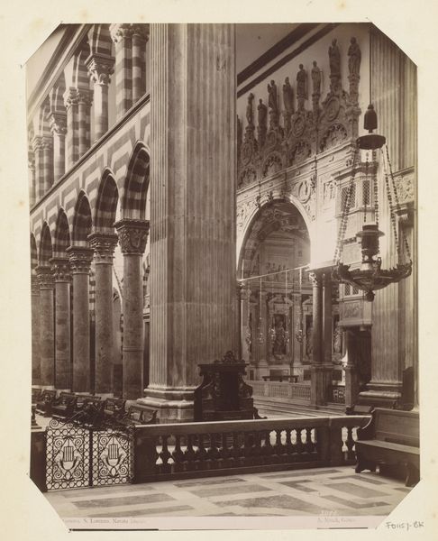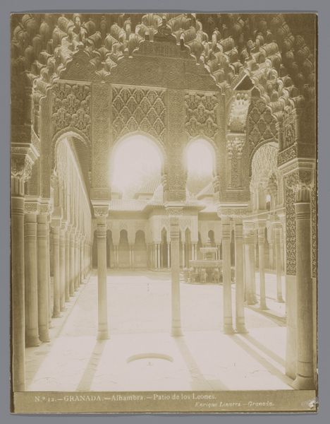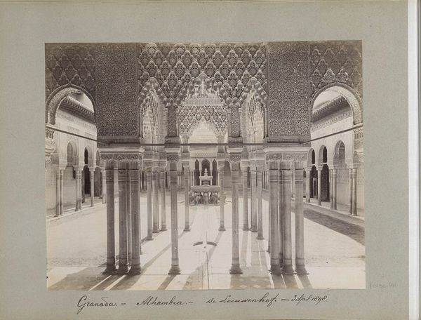 Curator: This gelatin-silver print, captured sometime between 1857 and 1880 by Juan Laurent, presents the Court of the Lions, a courtyard of the Alhambra in Granada. Editor: Immediately striking is the contrast between the intricate detailing above and the relatively smooth columns leading towards the light-filled center. It creates a sense of both enclosure and expansiveness. Curator: Indeed. And Laurent's choice of photography as a medium is significant. Consider the access it afforded to circulate imagery of Islamic art and architecture, challenging Orientalist fantasies even as it participated in them. This space, built by Muslims, was captured and consumed through a Western, photographic lens, making issues of power visible. Editor: Absolutely. The production of this photograph involves multiple stages: the gathering of materials, the transportation, the darkroom work itself, the development of the gelatin-silver print. Think of the labor embedded within the image, from the original artisans who carved the stone to the photographer in his darkroom! How many hands have touched the materials to create this print? Curator: Looking at the repetitive architectural patterns, I can't help but think about the gendered nature of space within the Alhambra. The courtyard may have served as a space for courtly spectacle, but also possibly as a private space accessible to women. Understanding its role reveals the intricacies of palace life and women’s lives within. Editor: It prompts questions about circulation and preservation. Was this intended as an artistic piece or as an artifact for record keeping? Photography democratized imagery but also industrialized documentation and influenced archival practice, with ripple effects across society. Curator: It’s important, though, to also view this photograph outside its ethnographic function. Beyond a historical document, it offers a profound aesthetic experience that asks questions about visibility and access within larger social and political frames. Editor: Exactly. By tracing the photographic process, we not only appreciate the technical skill involved, but are urged to recognize how photographic views impact the subject and culture displayed within it.