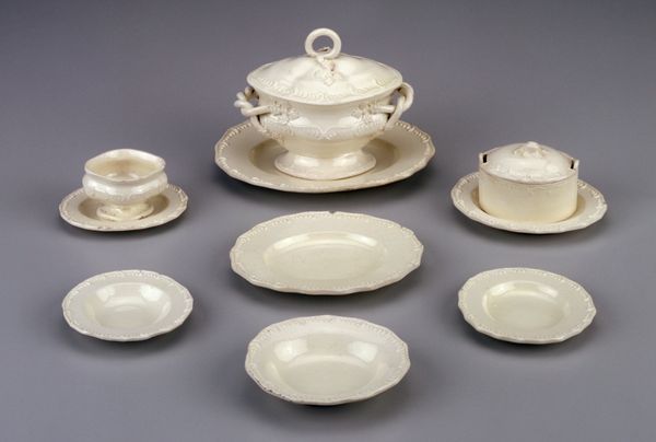 Here is an all-white cup and saucer by Pouyat, held at the Metropolitan Museum of Art. The smooth porcelain surface creates subtle gradations of light and shadow that are soothing to the eye. Notice how the artist employed relief work around the rims. The repeated motifs may be signs pointing to classical themes or mythological narratives. The play of light across these raised patterns enhances the textural quality. This engages us beyond mere functionality. The monochromatic palette invites close inspection of form and structure. This emphasizes the simplicity of its design. How does the cup's gently curved handle contrast with the saucer's flat expanse? These juxtapositions of shape and form create a visual harmony. They also reveal an underlying tension between utility and artistry. Consider this work's place within broader discussions of art, craft, and consumer culture. It's a reminder that everyday objects can also be carriers of meaning, imbued with aesthetic and cultural significance.