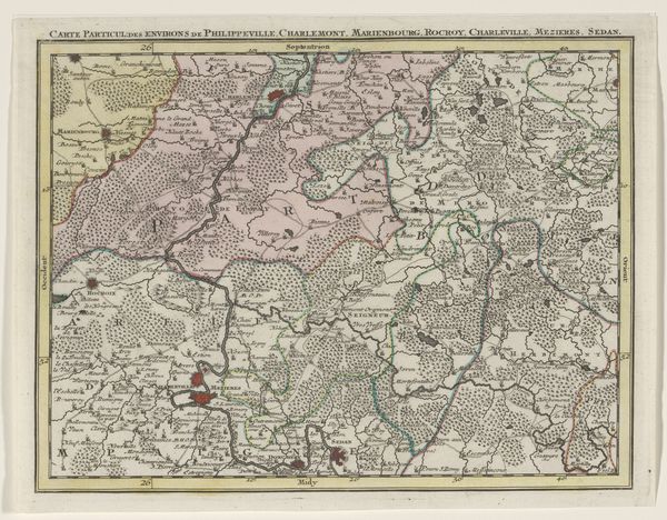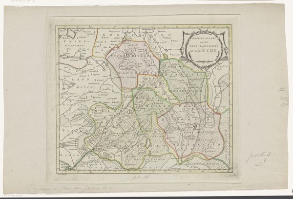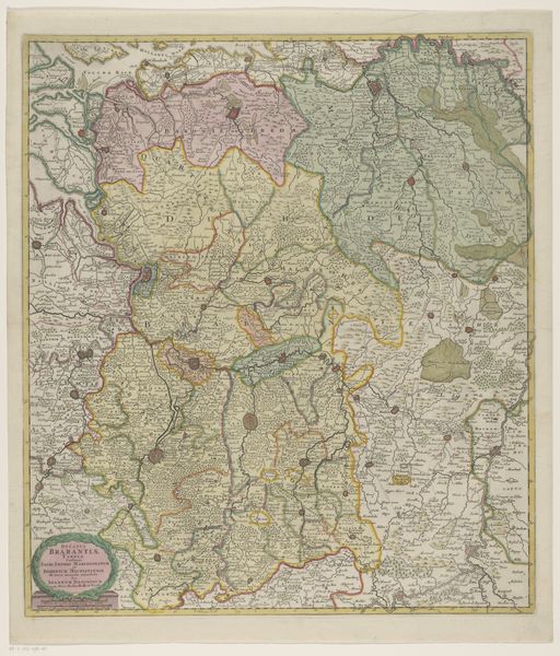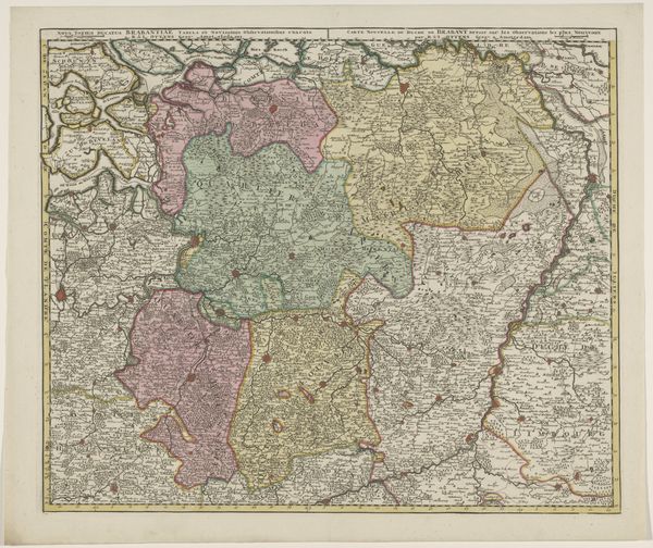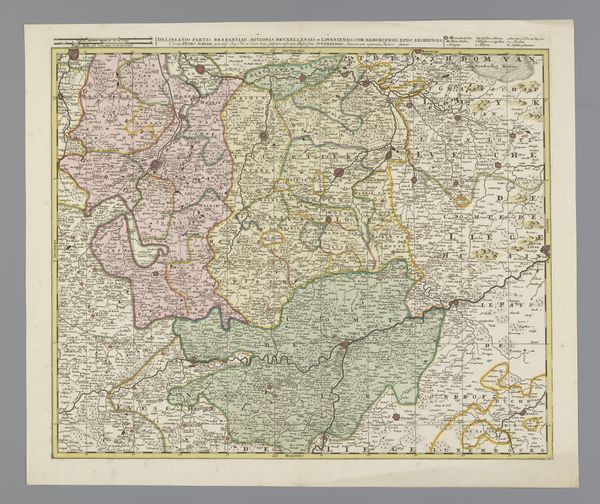 Curator: This print, dating from 1634 to 1696, is entitled 'Kaart van het zuidelijk deel van het hertogdom Brabant'. It’s held here at the Rijksmuseum and is by an anonymous maker. Editor: My initial response is intrigue; the colour palette and detailed lines really draw the eye in. It gives off a sense of formality, but there's an inherent aesthetic pleasure too in the structure of how space has been allocated. Curator: The cartographic rendering gives a good insight into production techniques. These engravings would have involved the skilled labor of artisans, painstakingly translating geographic knowledge onto a plate for mass production. This points to a developing society of trade and knowledge sharing. Editor: And yet, when focusing on the engraving itself, one sees the organization of the plane; a network of linear configurations delimiting landmasses, bodies of water, roads, etc. The symmetry within each segmented division creates balance despite what may have been a chaotic topography. Curator: Right, beyond its aesthetic or structural qualities, think about its context. The print was created during a period of political and economic transformation, when cartography itself became an integral tool for navigation, and exercising administrative control over land and trade. It also was vital for military endeavors. Editor: While I acknowledge the utility in these types of engravings, the aesthetic of order supersedes. Consider the embellishments, for example, that border and surround the inscription itself, providing both depth and visual interest beyond the map. Curator: But aren't these merely additional marketing embellishments on the landscape? Ultimately, the value for period buyers of the piece resides not simply in the composition, but in access to the raw geographical data and use they derive from its deployment for material reasons. Editor: Perhaps; nonetheless, to think that artistic intention or careful deployment of visual forms wasn’t given careful consideration seems naive, as this print can provide aesthetic pleasure that transcends geographical necessity. Curator: Agreed. Both aspects have to be kept in mind for the complete picture. Thank you. Editor: It was a pleasure.