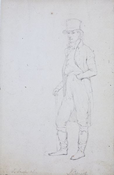 Editor: This drawing, “Bauer in kurzen Hosen und mit breitem Hut,” created around 1860 by Hugo Kauffmann, is quite striking with its use of coloured pencil. I'm intrigued by the figure's pose and attire; he looks simultaneously proud and vulnerable. What social commentary, if any, do you believe Kauffmann intended to express through this portrait? Curator: That’s a great observation. Looking at this, it’s crucial to consider the historical context of 1860. Genre paintings often served to idealize or critique societal roles, especially within burgeoning national identities. Kauffmann, working within Romanticism, likely aimed to portray the "common man." The fact that it’s a drawing suggests this might be a study, an exploration. Editor: An exploration of what exactly? The identity of the peasant? Curator: Potentially, yes. But through an intersectional lens, we can ask further questions: How is masculinity portrayed here? Is the peasant being romanticized, or is Kauffmann acknowledging the realities of rural life and labor? How does the depiction challenge or reinforce the prevalent class structure? Notice his gaze… It seems to resist any notion of romanticizing. Editor: I see your point. The man's stance and expression do have an element of defiance. This reminds me of a sort of push and pull. Curator: Exactly. The work highlights the complex power dynamics inherent in the act of representation itself, something important for our current dialogues surrounding equity, power, and class. What new thoughts come to mind knowing this? Editor: It encourages me to consider how contemporary art continues to wrestle with themes of representation and the politics of identity. It makes one really appreciate historical context! Thanks for helping unpack that.