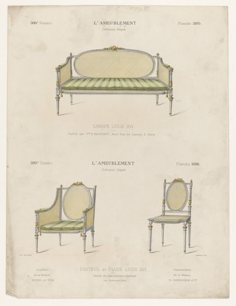 These Twee canapés, from an unknown date and creator, come to us as a commercial print. Let's consider how this kind of image circulated within a highly stratified society. These canapés, or small sofas, are not merely furniture; they are emblems of status and identity, of aspirational bourgeois life. The floral patterns and delicate lines speak to a particular sensibility and a specific class position. The detailed rendering, likely intended for prospective buyers, highlights the value placed on craftsmanship and the aesthetic refinement associated with luxury. Consider who had access to such commodities and who was excluded, the labor that produced these items, and the social rituals they facilitated. This print invites us to reflect on the complex relationships between consumerism, identity, and the historical forces that shape our desires and tastes.