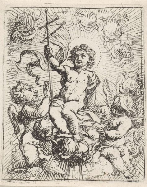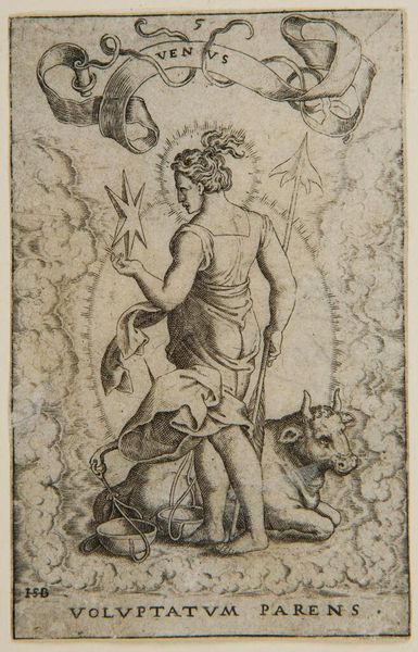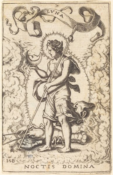 Editor: Here we have Theodor de Bry's engraving, Moon. It depicts a figure holding a crescent moon, surrounded by symbolic imagery. It feels very allegorical. What can we unpack from this image? Curator: It’s interesting how De Bry visualizes "Luna," connecting classical mythology with the burgeoning print culture. This image served not just as art but as a carrier of knowledge and social values. How might its accessibility have shaped its cultural impact? Editor: So, its widespread distribution influenced societal perspectives on classical themes? Curator: Precisely. These prints democratized imagery, impacting public understanding and even reshaping artistic and political discourse. Consider the role these played in disseminating ideas. What do you take away from understanding the context of printmaking at this time? Editor: Seeing it as a tool for disseminating ideas gives me a new appreciation for its cultural impact.