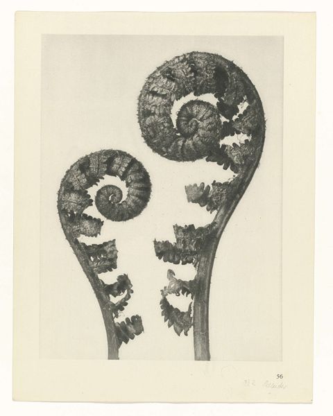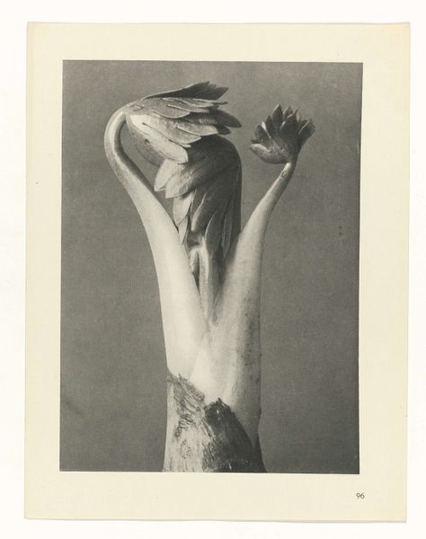 Curator: Looking at Karl Blossfeldt’s “Plant Study,” taken around 1928, what strikes you initially about this photogram? Editor: It feels almost architectural, like some Art Deco skyscraper rendered in sepia tones. Stark, geometric, but with a biological heart. Curator: That’s interesting. Blossfeldt’s work, especially these close-up botanical photographs, played a significant role in the New Objectivity movement in Germany. The goal was to reveal the inherent structure and formal elegance in nature, often unseen by the naked eye. It's about uncovering fundamental geometric forms. Editor: And there’s something undeniably radical about turning nature into, well, almost propaganda for industrial design. We’re using organic forms to validate the machine aesthetic. How does that tie into the socio-political climate of the time? Curator: The Bauhaus movement, with its focus on functionalism and the unity of art, craft, and technology, was highly influential. Blossfeldt's images were exhibited in galleries frequented by architects and designers. These forms mirrored the new urban landscape of Germany and a desire for simplification after World War I. This approach rejected the ornamental in favor of pure, unadorned design. Editor: Right, simplification born out of the trauma and hyperinflation, even collapse. But looking closer, I feel tension between celebrating inherent natural beauty and the potential for appropriation. Were Blossfeldt's intentions simply artistic, or were they inherently political? I keep thinking about how images of natural perfection were later exploited in propaganda. Curator: That’s a crucial point to consider. Blossfeldt saw himself primarily as an educator, using these photographs as teaching aids. The photogram’s reproducibility lends it democratic quality. These plant portraits were meant to highlight nature’s capacity to generate patterns, to invite deeper understanding. Its relationship to later ideological appropriations opens up a complicated ethical question. Editor: Absolutely. It also feels important that these images, celebrated at the time, may now offer insights into biodiversity and climate change if recontextualized as archival documentation. Curator: Thank you. Those tensions highlight the continuous nature of meaning-making as cultural context evolves. Editor: Yes, and reminds us that, despite seeming objective, art remains entrenched in a complex interplay between the intentions, perceptions, and politics that evolve across generations.
