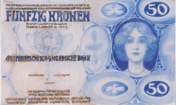 Koloman Moser designed this 50 crown note, likely with pen and ink, at the turn of the century. The composition seems to be built from modular, repeating forms: rows of triangles, spirals, and little egg shapes. You get the sense of a pattern maker whose process involves working out variations on a theme. The whole thing is awash in shades of blue, and this makes me think about how we associate color with value. Here, the cool monochrome palette lends a sense of austerity and makes the currency feel precious, even while the overall design has a whimsical, handmade quality. Look at the figure in the diamond at the right: a woman with flowing hair surrounded by concentric teardrops. Her pose is stylized, almost like a Byzantine icon, and yet the details of her face and hair are rendered with delicate naturalism. Moser was a key figure in the Vienna Secession, a movement that included Gustav Klimt. Thinking of Klimt’s opulent gold surfaces, it’s interesting to see Moser using a more restrained palette, and creating value through texture and pattern. It points to the incredible range of possibilities within a shared artistic milieu.
