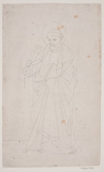 Editor: This is "Szene am Ausgang der Kirche_ Mephisto," a pencil drawing by Peter Cornelius from around 1811, currently at the Städel Museum. It's just a quick sketch, but the figure of Mephisto looks really theatrical. What stands out to you about the way Cornelius chose to represent him with pencil? Curator: The immediate draw for me is in thinking about Romanticism. This isn't some polished oil painting depicting a grand historical narrative; instead, we see the direct, unmediated mark of the artist's hand rendering the scene of a play. Notice, the *drawing* process is central here. It emphasizes the individual creation, the direct labour and act of making over a commodity, disrupting the rigid, academic painting establishment. Cornelius highlights the *means* of production, the intimacy of the studio. What are the material constraints here? The rough paper? A pencil? This brings art closer to craft, a tangible process anyone can perform. Editor: That's fascinating! I never thought about the choice of drawing as a sort of rebellious act. Curator: Exactly! The apparent sketchiness, even incompleteness of the work can be seen as its strength. It suggests Cornelius wasn’t interested in a slick, commercial artwork for the market but wanted instead to emphasise the *process* over a finalised product. That is, the actual art of making a scene from *Faust* more vividly. It suggests the role of the pencil wasn’t just to serve as a preparatory tool for a painting, but as the tool for an original work itself. Consider, too, how paper and pencil are comparatively available materials that level traditional notions of elite arts! Editor: So, by using a simple material like pencil, Cornelius is democratizing the artistic process and emphasizing craft. I will now notice drawing in collections, not as a mere preparatory instrument, but as artistic claim. Curator: Precisely. Reflect on what makes Cornelius tick when approaching your own artwork.