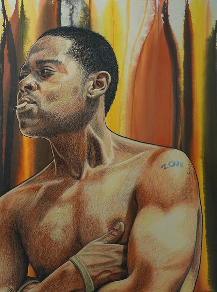 Editor: Here we have Monica Ikegwu's 2019 oil painting, "Broken Hearts." It's a striking, realist portrait. The most peculiar detail is the broken heart symbol etched near the subject's ear. What can you tell me about it? Curator: I'm immediately drawn to the materials themselves, the smooth gradations achieved with oil paint, and the very contemporary trend of using bodies as sites of inscription and branding, be that through haircuts or tattoos. Notice how the artist contrasts the smooth skin with the raw, unfinished background, blurring the line between the represented body and its support structure. Do you think the 'broken heart' adds value, literally and figuratively, or perhaps challenges notions of value and labor itself? Editor: That's a fascinating point! I hadn't considered the background as actively contributing to the meaning. The stark contrast between the realism of the portrait and that roughness makes me see how consumption is inherent here: a smooth commodified subject is displayed on a "raw," unfinished support. It looks both "high end" and handmade. It feels very intentional. Curator: Precisely. It asks us to question what labor went into making this artwork and what statement the author is making in the current socioeconomic environment. Perhaps she aims to democratize portraiture by revealing the artistic process itself. Editor: So it challenges traditional power structures of labor division that exist in art production. Wow! I'm so glad you pointed that out. I will have to look for this in other figurative art. Curator: Glad to open your eyes. Considering artwork in such ways always challenges my perspective.