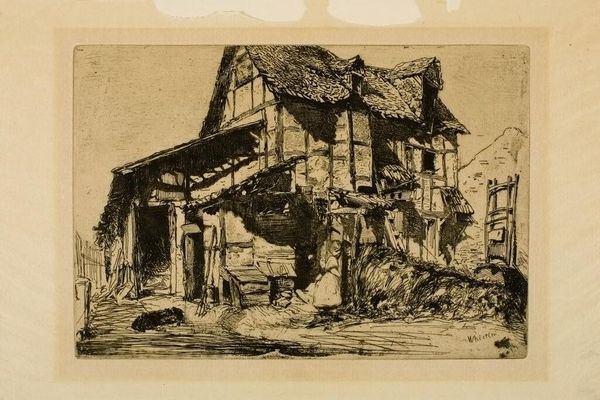 Curator: Whistler's etching, "The Unsafe Tenement," part of the Harvard Art Museums collection, depicts a dilapidated building with striking detail. The plate measures about 6 by 9 inches. Editor: The composition feels precarious, mirroring the state of the building itself. You immediately sense the weight of its decay. Curator: Whistler was fascinated by the material realities of urban life, the textures of the buildings, and the labor involved in their creation and inevitable disintegration. Note the intricate lines suggesting the crumbling structure. Editor: The image speaks volumes about urban poverty and the social conditions in which such dwellings existed, raising questions about access to safe housing. Curator: Absolutely, and Whistler's printing process itself, the deliberate mark-making and plate-wiping, becomes a commentary on the work involved in depicting this environment. Editor: A somber yet evocative piece. It leaves you pondering the stories held within such spaces.