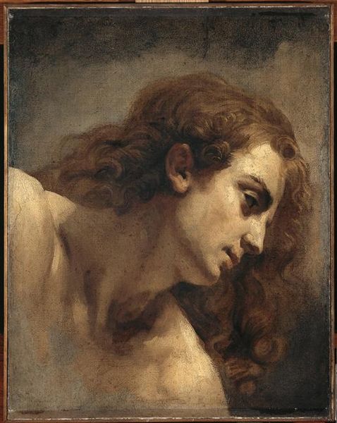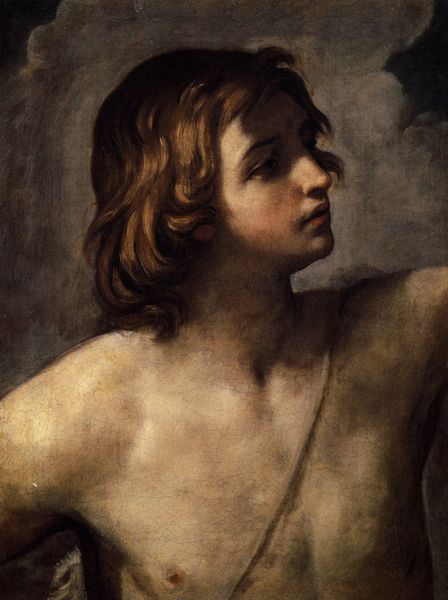 Editor: Here we have "David with the Head of Goliath" painted around 1625 by Gian Lorenzo Bernini. I’m struck by David's expression, which is not triumphant, but almost…disturbed. How do you interpret this work? Curator: Indeed. It's fascinating how Bernini, primarily known as a sculptor, infuses this painting with psychological complexity. The visual language is laden with symbolism beyond the obvious biblical narrative. Consider the dark background against David’s illuminated figure, almost like a halo. Editor: Yes, that contrast really highlights his youth and…vulnerability, perhaps? Is that intentional, to show more than just David as a conquering hero? Curator: Precisely! Look closely at Goliath's head. It’s not just a trophy, but a weighty emblem. Notice how David grips the hair. It symbolizes the tangible burden of leadership, victory, and its psychological aftermath. The baroque painters loved to show raw emotion and intense moments in the protagonists' faces. Do you get the same impression? Editor: Yes, I can see how David seems to be processing something profound rather than reveling in victory. He almost looks like he is turning towards his own humanity, leaving childhood behind. Curator: He seems suspended between boy and man, triumph and trauma. This suspension became a defining motif of the baroque period's emphasis on spiritual exploration and transformation through art. It's an interplay between the heroic and the human that invites deeper contemplation. Editor: I see now. I hadn't considered all of these subtle symbolic details before. Thanks! Curator: My pleasure! It’s these visual echoes that resonate across centuries, keeping cultural memories alive.