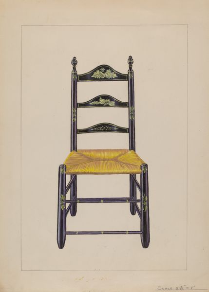 Lawrence Flynn rendered this image of a Hitchcock Chair sometime in the 20th century using graphite, watercolor, and colored pencil on paper. It depicts a style of chair mass-produced in Connecticut during the first half of the 19th century. These stenciled chairs, often affordable, brought a touch of elegance to middle-class homes across the expanding United States. The visual codes, like the classical motifs on the chair's crest rail, reflect aspirations of refinement in a young nation eager to establish its own cultural identity, distinct from its European roots. This particular image was made during a period when there was renewed interest in American folk art and design. Understanding this image requires a look at the history of design and manufacturing in the United States. Research into trade catalogs and period advertisements could reveal much about the social and economic context in which objects like the Hitchcock chair were originally produced and consumed, as well as how it was reinterpreted in the 20th century. Art history is never just about aesthetics; it's about understanding the values and aspirations of a society through its material culture.