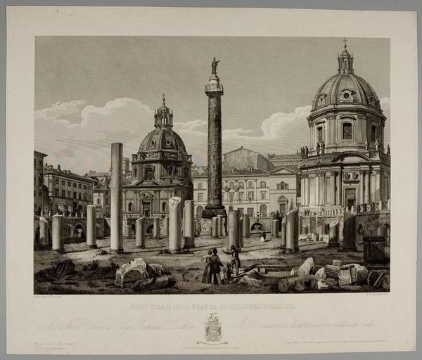 Editor: This drawing, a view of a piazza in Rome by an unknown British artist, is quite striking in its symmetry and use of sepia tones. What compositional elements stand out to you? Curator: Observe how the artist uses linear perspective to create depth, converging our gaze upon a vanishing point beyond the obelisk. The dual churches mirror each other, but subtle variations in the drawing prevent absolute symmetry. Editor: So, the slight imperfections add visual interest? Curator: Precisely. Notice the weight of the lines, the hatching and cross-hatching that build volume and shadow. The artist's hand skillfully guides us through the architectural forms. I find it intriguing. Editor: I appreciate how you highlighted the nuances in what I initially perceived as perfect symmetry. Curator: Indeed, the beauty lies in the details.
