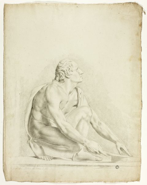 Pietro Fancelli’s "Nude Male Academy" presents a study in graphite, focusing on the seated male figure. The soft, diffused lighting evokes a contemplative mood, emphasizing the subtle gradations of tone across the model's body. The composition directs our attention through the model's pose. The placement of limbs creates a series of interlocking triangles, lending a sense of stability. This classical structure is, however, disrupted by the dynamic asymmetry of the figure's gaze and outstretched arm. In this piece, Fancelli engages with the academic tradition while subtly questioning its conventions. The emphasis on anatomical precision is paired with an expressive rendering of the model's psychological state. This tension between the ideal and the real underscores the drawing's complex negotiation between formal study and artistic expression. The work invites continuous re-evaluation.