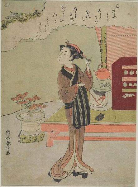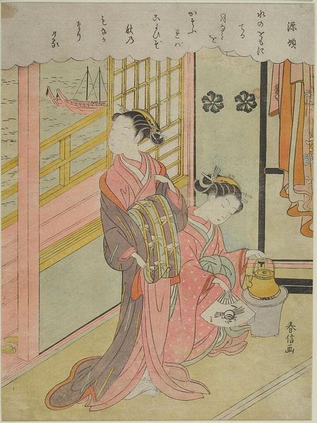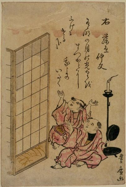 Editor: So, this is Suzuki Harunobu's "Child Playing with Ink." It's striking how intimate this scene feels, almost like a snapshot. What do you see in this piece? Curator: I see a powerful commentary on the role of women and education in 18th-century Japan. The child, seemingly engrossed in calligraphy, challenges the expected domestic roles assigned to women. The print hints at a desire for female intellectual expression beyond traditional boundaries. Editor: I hadn't considered that. Curator: The woman standing also seems caught between worlds: she is in a kimono, a sign of traditional society, and her contemplative pose and the poem allude to the rich interior life of the female subject. Do you think the poem might give us further insight? Editor: That's true, I wonder what it means! I'll have to find a translation. Curator: Exactly! Context opens up new ways of seeing. Editor: I definitely learned a lot!