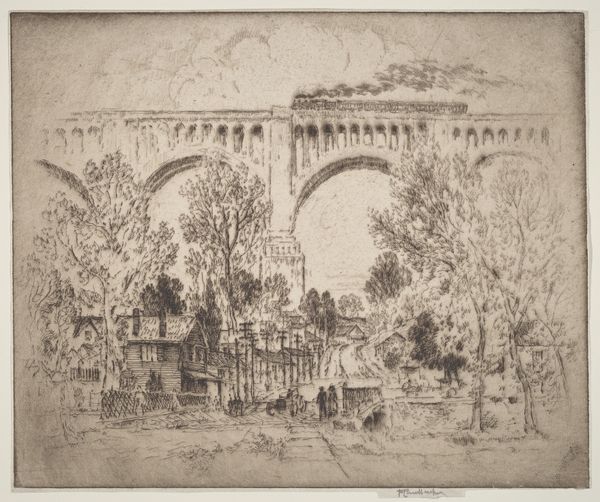 Curator: "The Crystal Palace," a 1905 etching by Joseph Pennell. Look at the sheer texture of the etching, so delicately wrought! Editor: My first impression is one of nostalgia, or perhaps loss. The sepia tones and the somewhat blurry, indistinct lines create a dreamlike, ephemeral quality. Curator: Yes, Pennell certainly captures a sense of fading grandeur here. Etching as a printmaking process is quite labour-intensive, involving acid-resistant coatings and multiple applications to achieve such depth. It speaks to the architectural ambition, doesn't it? And the image hints at this building’s cultural impact. Editor: Indeed. Notice how the structural elements of the Crystal Palace dominate the composition. The eye is drawn to the elaborate, arched roofline. Then we’re presented with formal arrangements of structures across the immediate scene. Pennell creates visual rhymes, linking foreground to background. Curator: We have to consider the historical context too. The Crystal Palace, initially erected for the Great Exhibition of 1851, stood as a symbol of Victorian innovation and British imperial power. Its eventual destruction by fire in 1936 marked the end of an era. The etching was done earlier in 1905 and contains within it this sense of impending loss. Editor: Good point. The muted palette emphasizes this sense of melancholy, the subdued, desaturated hues further conveying decay. There is also the relationship between this grand, impressive architecture, with the natural elements which have the opportunity to outlive it, trees and clouds adding a wistful poignancy. Curator: Right, and thinking about Pennell as a key figure in promoting etching as a legitimate art form is relevant here. It's not simply documentation. The print is deliberately crafted with aesthetic considerations, raising important questions about labour in both the craft and high arts worlds. Editor: I see what you mean. It makes one consider the relationship between structure and environment, grandeur and ruin, the monumental and the intimate. It's all beautifully ambiguous. Curator: So, it’s a compelling illustration of both Victorian aspiration and transience. Editor: Yes, I think I appreciate it a little more having considered its formal attributes and cultural context. It becomes a very resonant piece when one is considering its layered details.