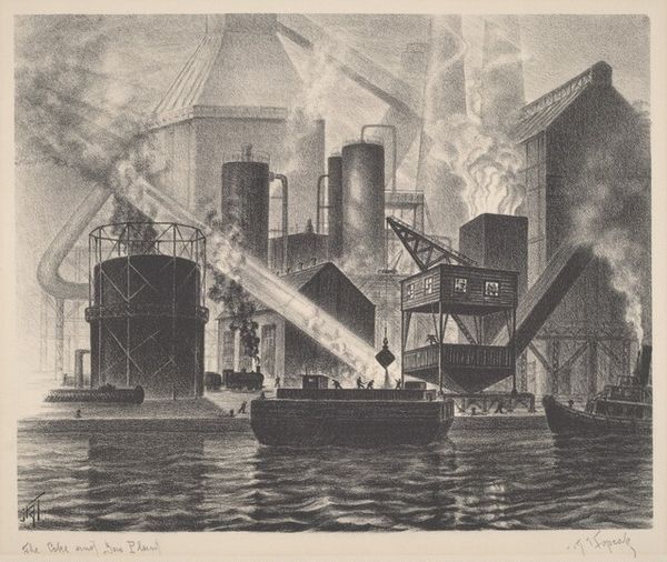 Harry Sternberg made this print, *Forest of Flame*, using lithography. Look at the way he coaxes tone out of the stone, building atmosphere with these tiny, energetic marks. It’s a process of layering and rubbing, right? I love how the industrial forms become characters here. The smokestacks are so solid, like watchful figures dominating the landscape. There's a real contrast between the sharp lines of the buildings and the soft, almost smudgy, smoke billowing around them. Check out the lower left corner, where a little train chugs along. Those tiny figures seem dwarfed by the scale of the factory. It’s like Sternberg is showing us the human cost of industry, but with a kind of stark beauty, you know? I think about other artists who grappled with similar themes, like the German Expressionists, who found ways to use distorted forms and high contrast to get at emotional truths.