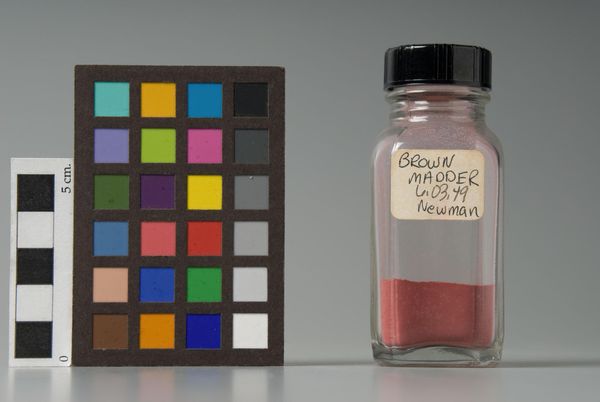Editor: So here we have "Mars Orange," pigment manufactured by F. Weber & Company. There's a jar of vibrant orange powder next to what looks like a color calibration card. I'm struck by its directness. What do you make of it? Curator: It's a beautifully pragmatic still life, isn't it? I imagine some artist, mixing, experimenting, reaching for that perfect Martian hue. That little jar holds the promise of a thousand sunsets. Does it make you wonder what masterpieces this color helped create? Editor: Definitely! It’s like holding potential itself. I never thought of pigment as a subject worthy of display. Curator: Exactly! It reminds us that art isn't just about the final product, but the materials, the process, the very essence of color. Editor: It makes you appreciate the artistry in the mundane, I guess. Thanks!