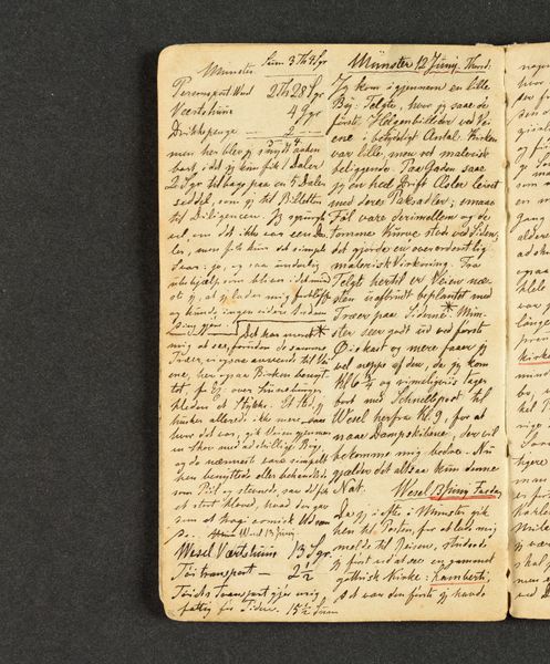 Curator: Welcome. We're looking at "Rejsedagbog," or "Travel Diary," by Johan Thomas Lundbye, created in 1845. The work is held at the SMK, the National Gallery of Denmark. It's rendered in ink and pencil on paper and is a tiny miniature. Editor: It looks like handwriting on parchment. I immediately feel the artist's hand directly conveying something intimate through written records. Curator: Precisely. As a formal element, the artist’s hand dominates. Notice how Lundbye employs dense strokes of both ink and graphite pencil to transcribe meticulous details of daily experience into compressed entries on the page. The structural qualities of this piece reveal a convergence of text and image. Editor: The “daily experience” must be interrogated. Think of the sociopolitical conditions informing Lundbye’s mobility. His travels become encoded with a very specific subjectivity tied to gender and class. Were the economic conditions of travel equally available to others in Danish society? What does access to leisurely, artistic travel signify in this particular historical moment? Curator: Undoubtedly, these sociopolitical realities inform Lundbye’s art. However, one might also analyze how Lundbye creates layers and patterns on the page. Calligraphic form supplants textual content through dense compositional rendering. Editor: This illegibility you note embodies social exclusion! Those who could not read were barred from fully participating in modern, bourgeois society. Calligraphic form never fully transcends its status as an artifact that either includes or excludes readers. The script underscores who can and cannot participate in travelogues. Curator: Interesting how this tiny personal narrative unfolds with dense layers of intention. Editor: And its echoes across time! It begs us to remember what we privilege, whose voices we elevate, and which forms of history deserve our most rigorous analysis.