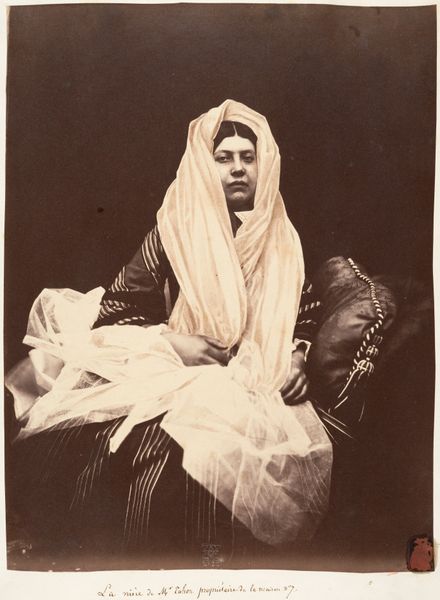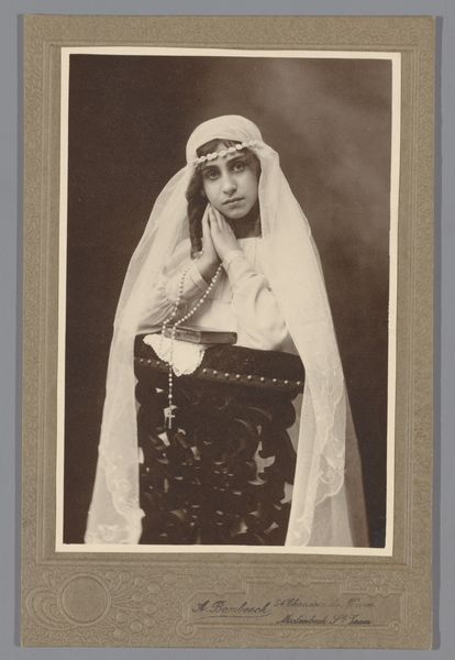 Curator: This photograph, likely taken between 1887 and 1900 by G. Lekegian & Co., is titled "Portrait of an Unknown Veiled Turkish Woman." Editor: The immediate impression is one of guarded beauty. The composition draws the eye to her gaze, the only exposed part of her face, softened by the delicate fabric. Curator: Indeed, the work exemplifies Orientalist tropes prevalent during that era, feeding into Western fascination with and often misrepresentation of Eastern cultures. What appears exotic also raises questions about agency and representation. Who was she, and what role did she play in its creation? Editor: Technically, the limited tonal range is compelling. The play of light on the different layers of fabric, the subtle gradations in the background—they almost lend a painterly quality to the photograph. Curator: But that light, carefully orchestrated, also highlights the limitations placed upon her. The veil, while perhaps culturally significant, visually speaks to restriction and anonymity. How complicit was she in constructing that image? Was this taken for a Western audience? Editor: I concede that context, but I see the subject's composed gaze as piercing. The composition itself is strong: the contrasting textures—the smooth veil against the ornamented rings—create a striking visual dynamic. Curator: True, yet these carefully chosen adornments perhaps tell us about the sitter’s class, or lack thereof; further contextual inquiry into photography during the turn of the century might yield insights. Did the studio dictate the entire look and feel? Were similar photographic practices enforced in other parts of the world? Editor: A useful point. Nevertheless, beyond the socio-historical reading, the artist achieved formal harmonies here. The photographer clearly was trying to imbue this “anonymous” portrait with qualities meant to elevate it. Curator: It reminds us that historical images, however beautiful or well-composed, need critical analysis regarding identity, cultural exchange, and often, colonial power dynamics. Editor: And sometimes it’s good to just stand back and marvel at the way a photographer was able to turn a captured moment into something undeniably exquisite.