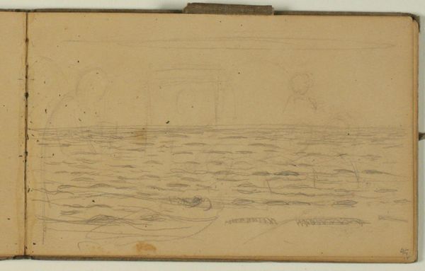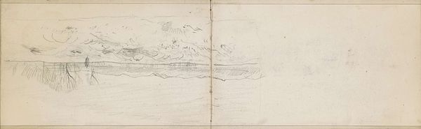 Curator: Today we're looking at "Møns Klint, set fra Filskov," a work by Niels Larsen Stevns created in 1885. It’s rendered in pencil and colored pencil on paper and resides here at the SMK, Statens Museum for Kunst. Editor: It's incredibly subtle, almost ghostly. The monochromatic palette creates a very muted and still atmosphere. You immediately notice the very faint lines suggesting movement in the water. Curator: What interests me is how Stevns situates this landscape within the sociopolitical climate of 19th-century Denmark, grappling with national identity. Consider the romantic nationalism movement of the time, with artists like Stevns seeking to capture the essence of Danish landscapes. How might the scale of the cliff – so much bigger than the sailboat – comment on colonial power dynamics, perhaps? Editor: Scale is a very good point, actually. The sailboat is minute, isn't it? Visually, that acute triangle is the starkest contrast. I would rather decode this visual structure by focusing on Stevns’ lines. They are fragile, almost unsure, to give texture to the waters but firm around the faint silhouette of the sailing boat. He very strategically brings the whole scene together to one distinct narrative. Curator: Yes, I can agree. These sketches helped to visualise and assert a sense of cultural distinctiveness, celebrating its landscapes as a core part of Danish identity, resisting external cultural influences during that period of complex transition. It would not be about one strong cultural beacon in the age of colonisation. Instead, a very delicate sailboat moving on the waters. Editor: What I take from that suggestion is that he really captures a particular, distinct sense of motion and ephemerality of an era in this very quick study. I appreciate the understated virtuosity, almost reticent. Curator: Ultimately, examining this drawing provides a poignant insight into the complexities of representing national identity through art. Stevns’ “Møns Klint, set fra Filskov” becomes more than just a depiction of nature. Editor: Indeed. When looking through his marks, one can learn the strategic employment of minimalism and that will teach much about Stevns' artistic sensitivity, how simple elements speak loudly together, the real Danish melancholy.